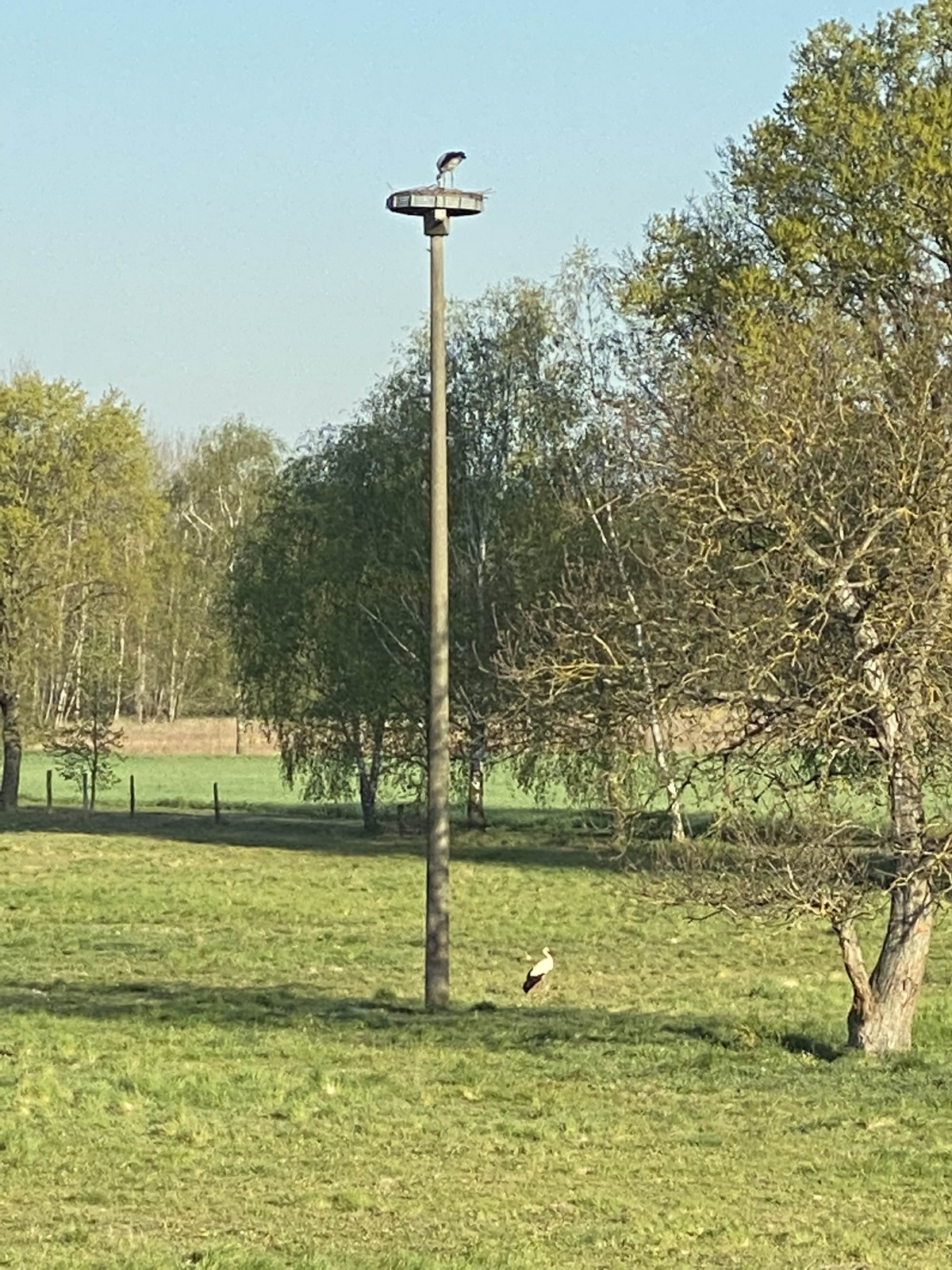 Ein Storchenpaar ist wieder in Rieplos angekommen und richtet sich auf dem 2012 errichteten Storchennest ein.