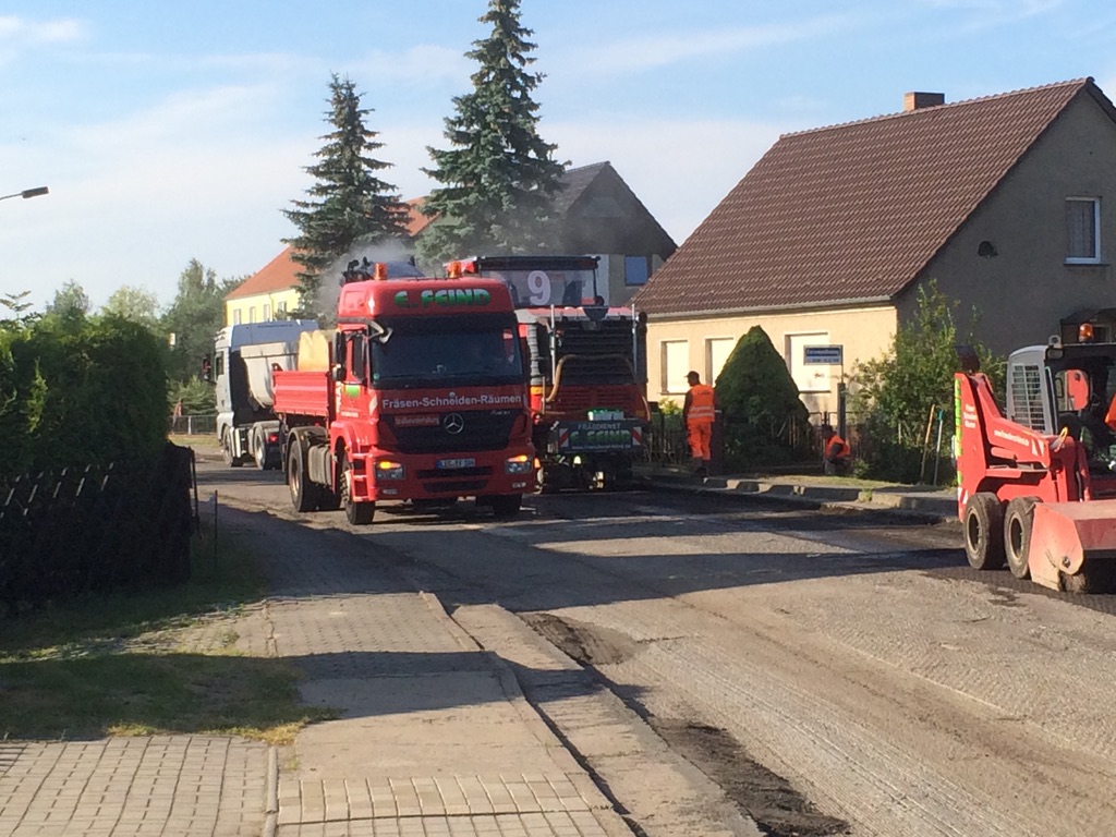 Erneuerung der Deckschicht der Rieploser Hauptstraße. Neben der Sanierung des Fahrbahnbelages lässt der "Landesbetrieb Straßenwesen" auch Reparaturen an Randeinfassungen und Entwässerungsanlagen ausführen. Auftragnehmer ist das Unternehmen Oevermann Verkehrswegebau GmbH aus Eisenhüttenstadt. Die Auftragssumme beträgt etwa 233 000 Euro.