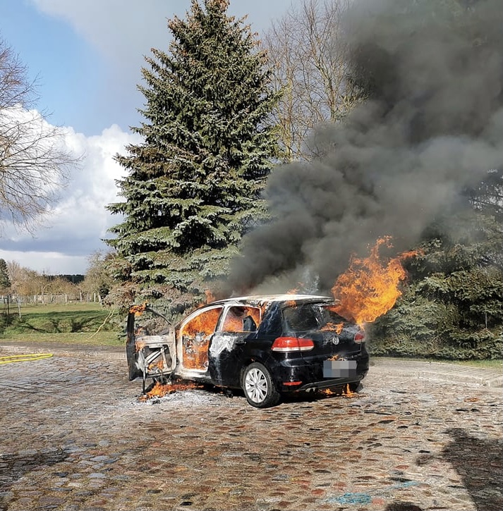 Ein VW Golf ist anscheinend durch einen technischen Defekt in Brand geraten. Das Feuer wurde anscheinend durch einen Kurzschluss im elektrischen System, hinter dem Amaturenbrett ausgelöst. Die Insassen blieben unverletzt. Feuerwehren aus Rieplos, Philadelphia, Storkow und Spreenhagen löschten den Brand.