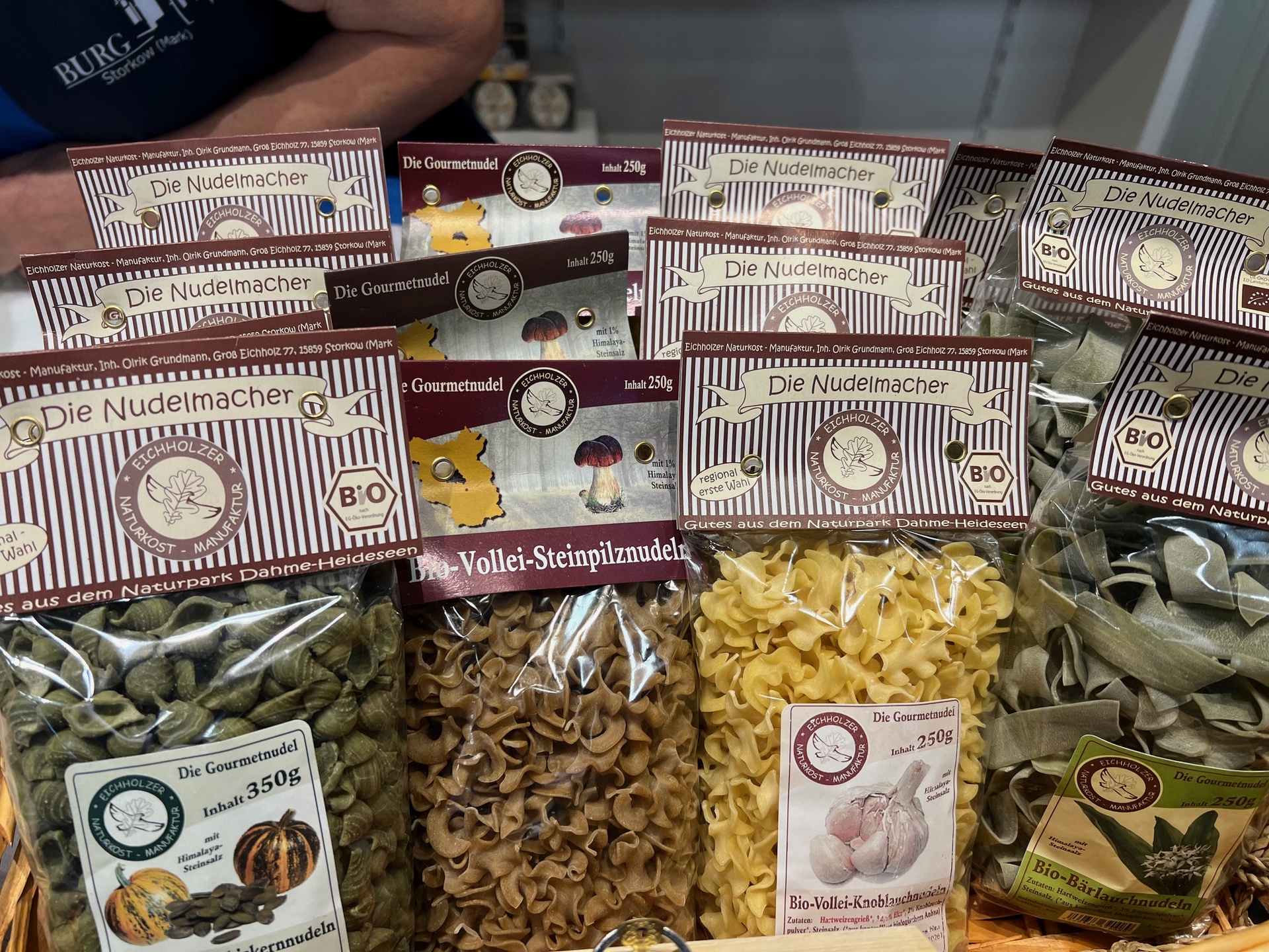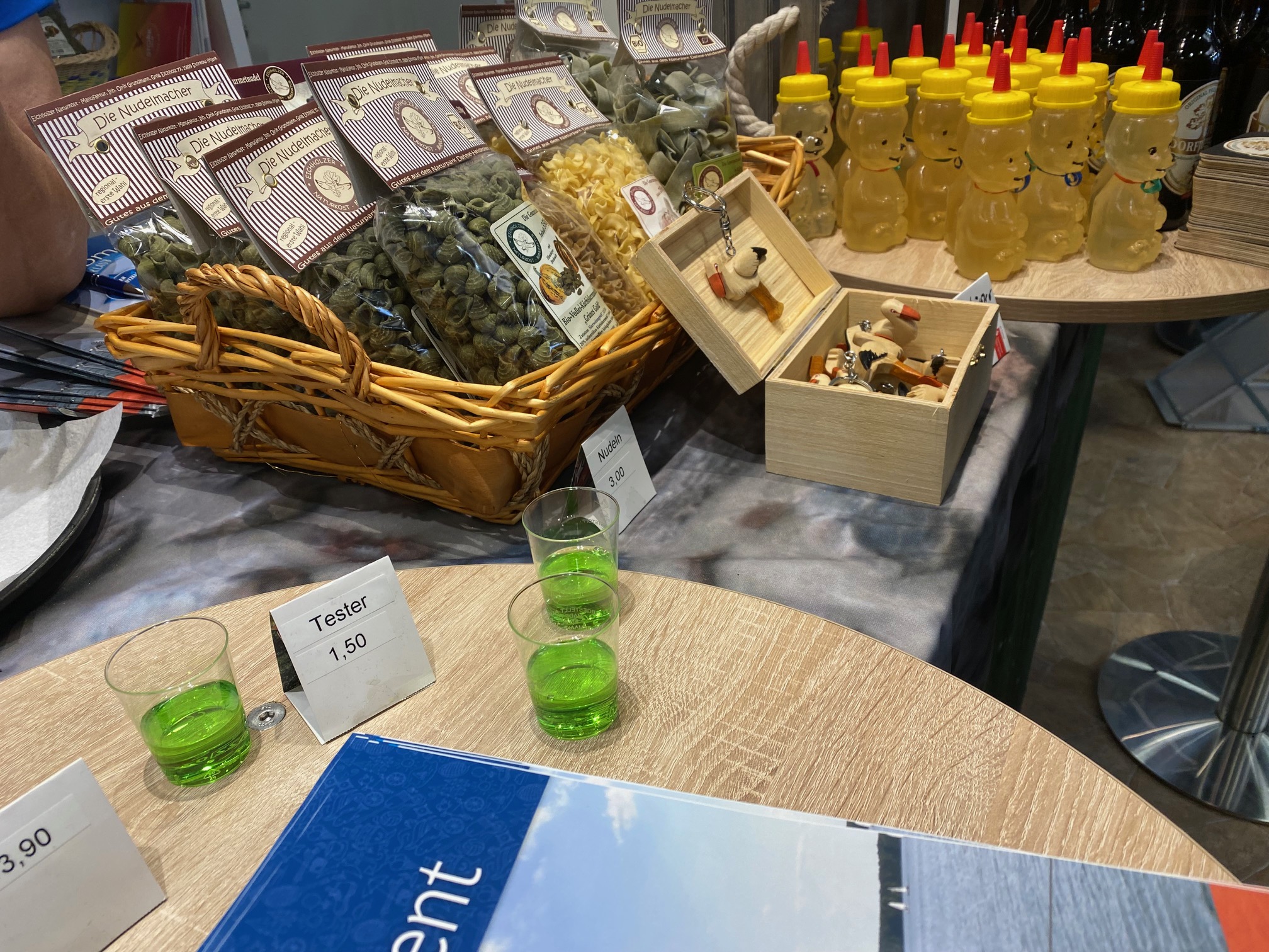 Das Bier aus Philadelphia (Dorfjunge) war ebenfalls zu bekommen. Angeboten wurden unter anderem: verschiedene Nudeln, Magneten, Schlüsselanhänger, Honig und einiges mehr. Viele, der in Manufakturarbeit hergestellten Produkte können ab Februar 2024 in der Burg Storkow erworben werden.