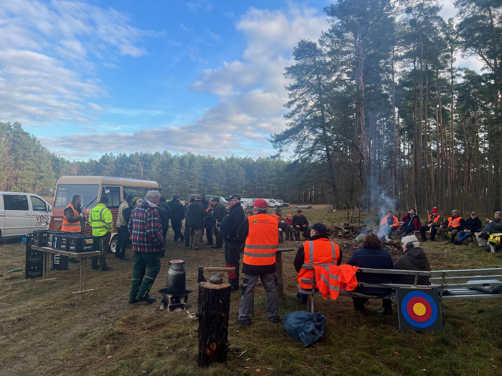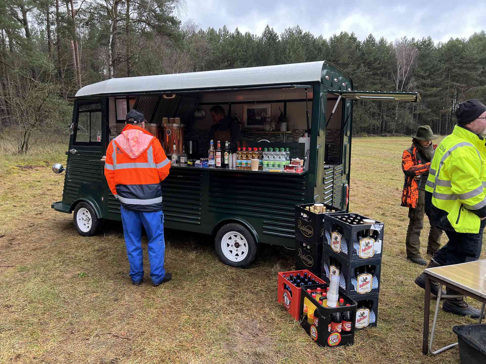 Nach Stunden in der freien Natur kehrten die Jäger und Treiber gegen Mittag erschöpft, aber zufrieden, zum Mittagessen auf einer Lichtung ein. Dort empfing die Fa. Voss die Gruppe mit herzlicher Gastfreundschaft und einer vorzüglichen Verpflegung. Die Gastronomen hatten sich alle Mühe gegeben, um den Tag kulinarisch abzurunden.